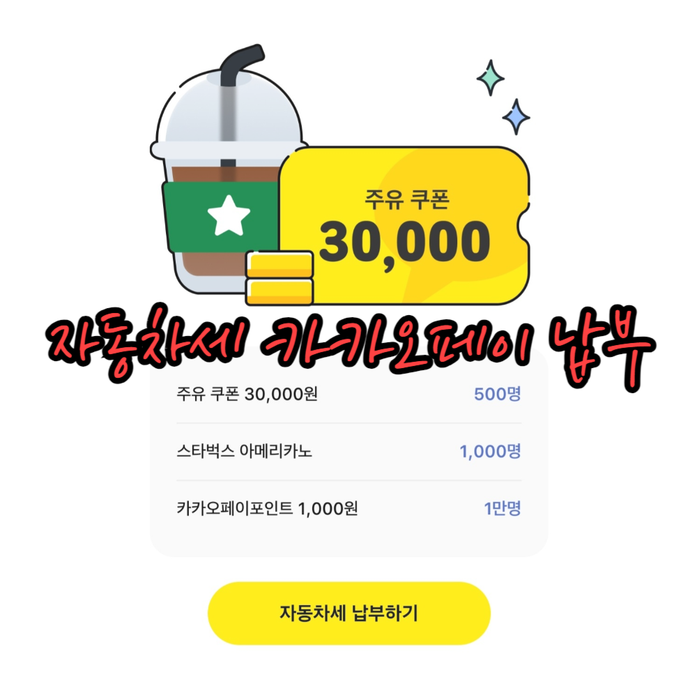 카카오페이로 6월 13일부터 30일까지 자동차세 납부를 하게 되면 주유 쿠폰 3만 원, 스타벅스 아메리카노 커피쿠폰, 카카오페이 포인트 1,000원 당첨 기회를 얻게 됩니다.